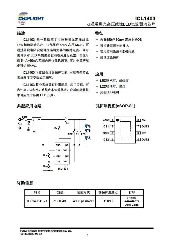 ICL1403 是一款適應于可控硅調(diào)光高壓線性LED 恒流驅(qū)動芯片,內(nèi)部集成550V高壓MOS??赏ㄟ^外設電阻設定可控硅調(diào)光器的維持電流,同時也可以對 LED 所需要的驅(qū)動電流進行設置,電流可在 5mA~60mA 范圍內(nèi)進行任意調(diào)節(jié),芯片電流精準度可達到+3%。