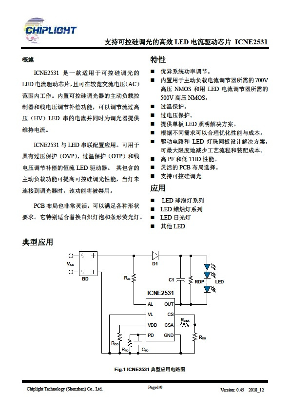 ICNE2531是一款適用于可控硅調(diào)光的LED 電流驅(qū)動芯片,且可在較寬交流電壓(AC)范圍內(nèi)工作。內(nèi)置可控硅調(diào)光器的主動負(fù)載控制器和線電壓調(diào)節(jié)補(bǔ)償功能,可以調(diào)節(jié)流過高壓(HV)IED 串的電流并同時為調(diào)光器提供維持電流。