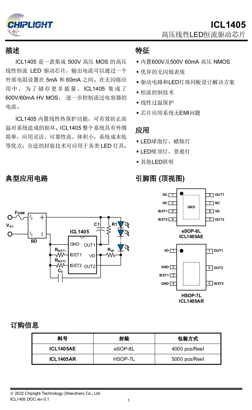 ICL1405 是一款集成 500V高壓 MOS 的高壓線性恒流LED驅(qū)動(dòng)芯片,輸出電流可以通過一個(gè)外部電阻設(shè)置在5mA和60mA之間。在無(wú)閃爍應(yīng)用中,為了儲(chǔ)存更多能量,ICL1405集成了600V/60mAHVMOS,進(jìn)一步控制流過電容器的電流。