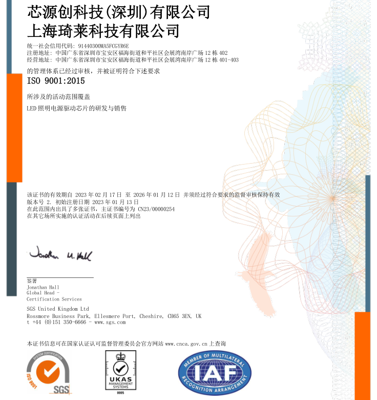 ? ? ? ?2023年2月17日,芯源創(chuàng)成功通過ISO9001質(zhì)量管理體系認(rèn)證。這是對公司各項(xiàng)管理工作標(biāo)準(zhǔn)化、規(guī)范化的肯定,也是進(jìn)一步提升企業(yè)管理體系,為公司規(guī)范制度、穩(wěn)健經(jīng)營、快速發(fā)展奠定堅(jiān)實(shí)的基礎(chǔ)。