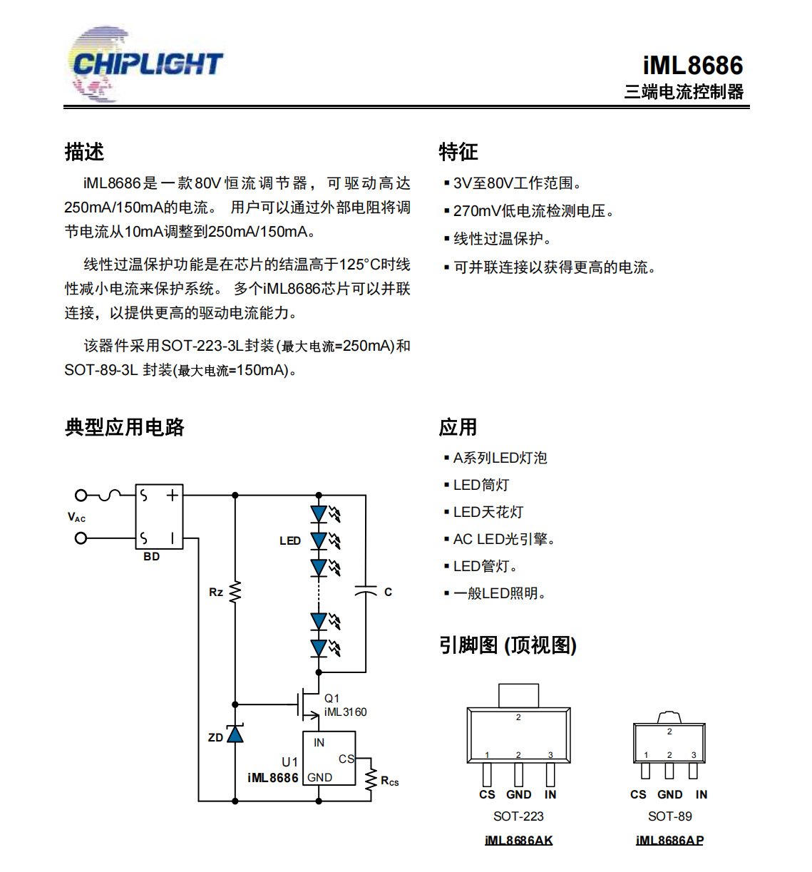 iML8686是一款80V恒流調節(jié)器,可驅動高達用戶可以通過外部電阻將調250mA/150mA的電流。節(jié)電流從10mA調整到250mA/150mA。