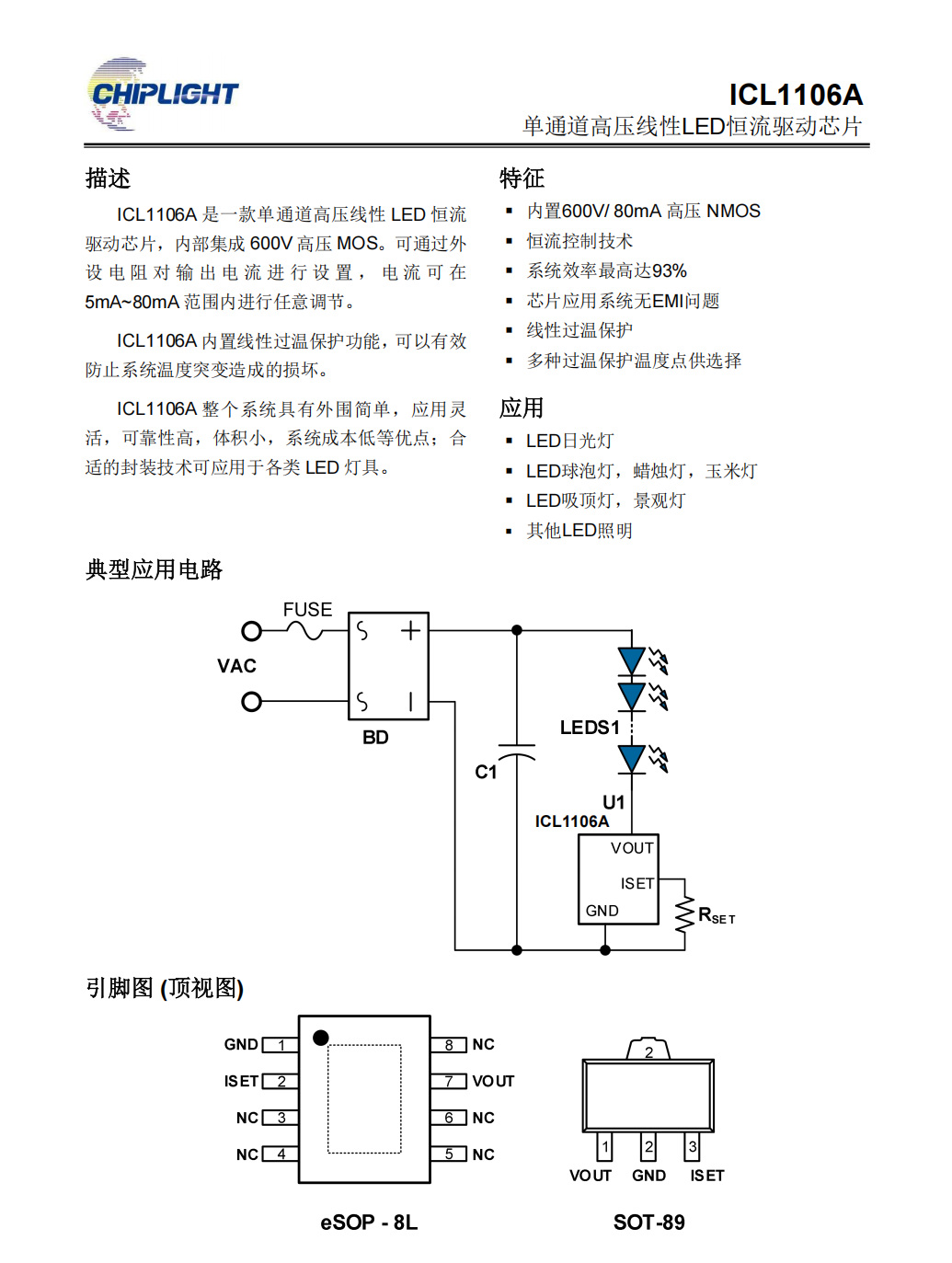ICL1106A 是一款單通道高壓線性 LED 恒流驅(qū)動芯片,內(nèi)部集成 600V高壓 MOS??赏ㄟ^外設(shè)電阻對輸出電流進行設(shè)置,電流可在5mA~80mA 范圍內(nèi)進行任意調(diào)節(jié)。